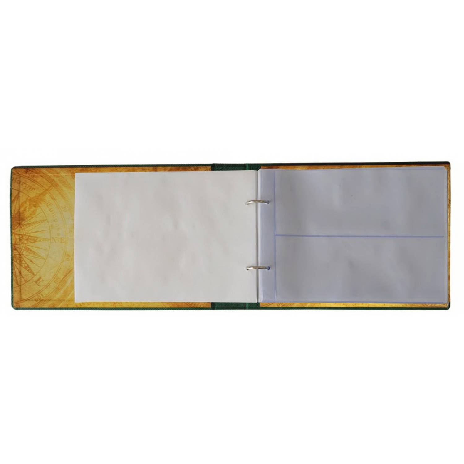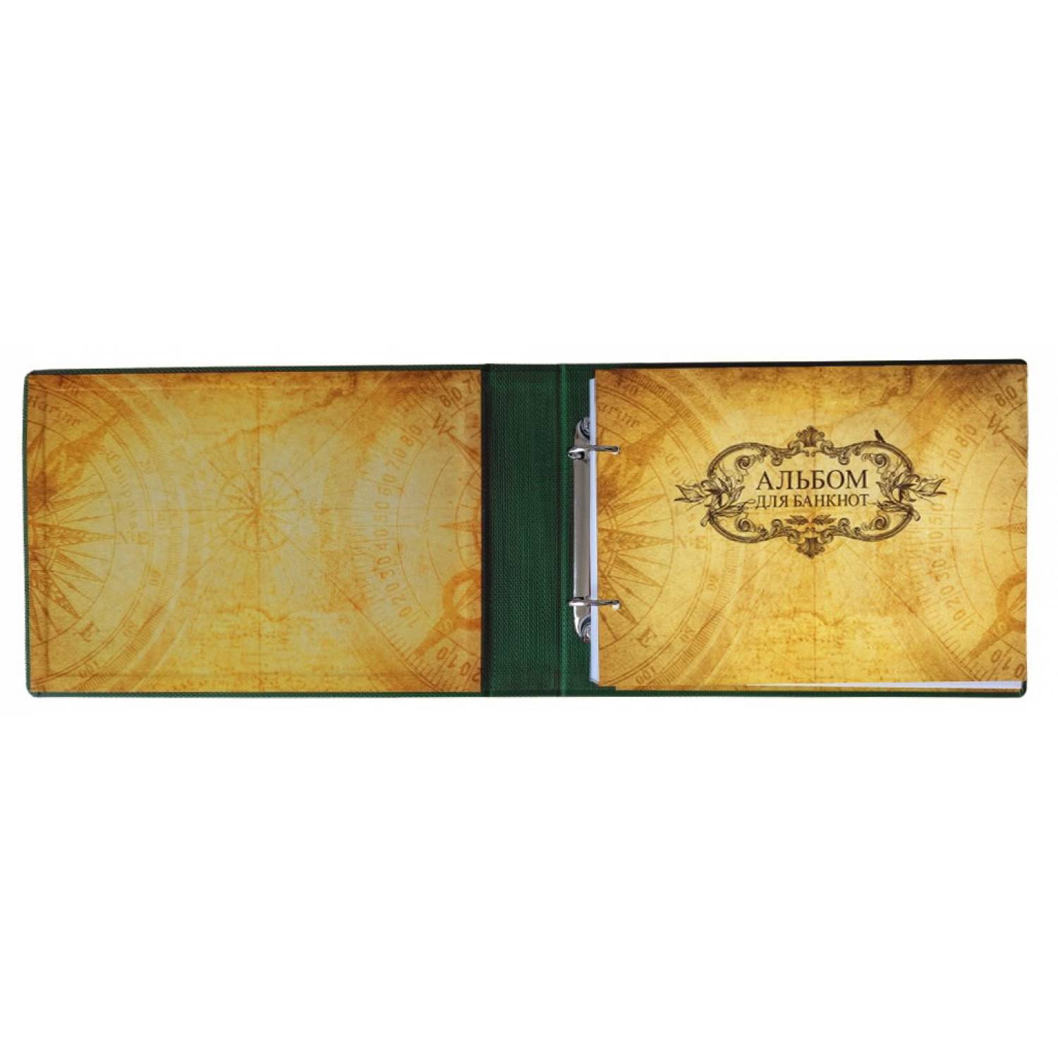 Альбом для банкнот. Обкладинка: покривка штучна шкіра, сторонки картон палітурний з поролоном. Блок складається з 20х куліс на 2 секції 200х75мм. Між кулісами перекладки з пергаменту. Скріплення - кільцевий механізм. Є можливість додавати куліси.